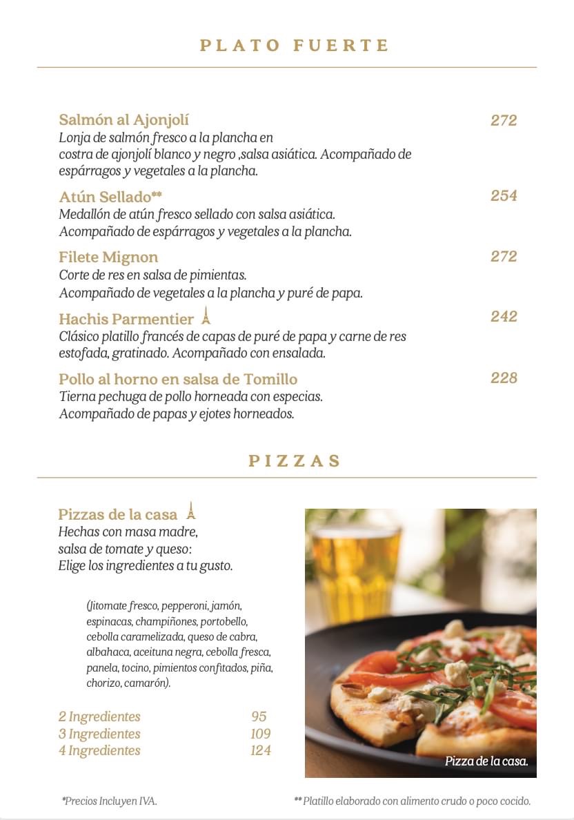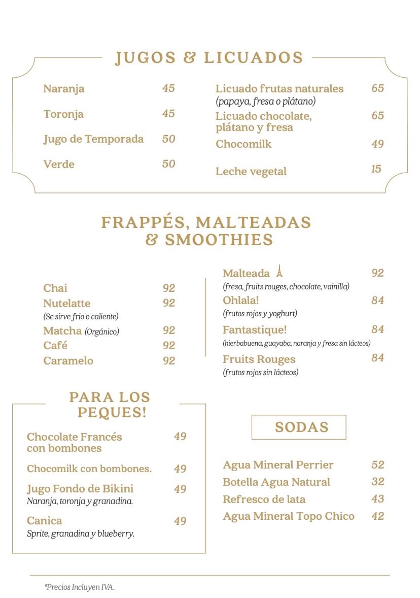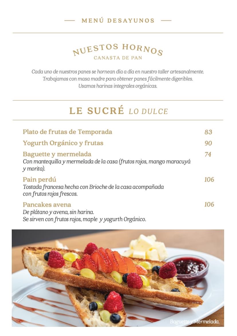 1 Baguette de especialidad, 1 bebida, 1 porcion de fruta de temporada, 1 mini pan de la casa y 1 brownie.